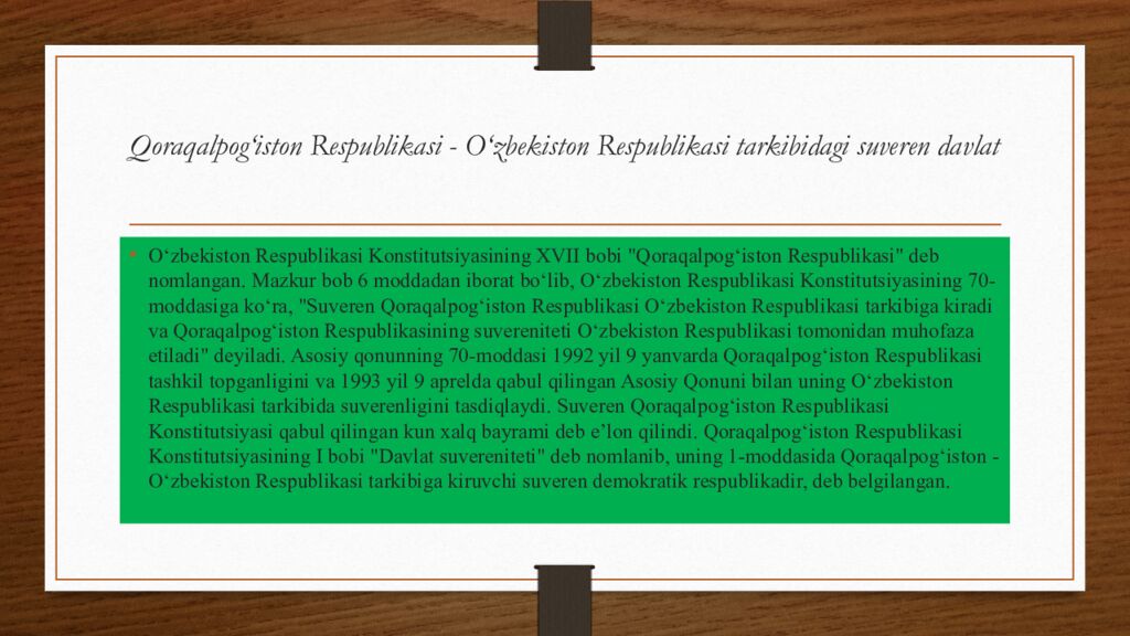 O‘zbekiston Respublikasi Konstitutsiyasining XVII bobi " Qoraqalpog‘iston Respublikasi " deb nomlangan. Mazkur bob 6 moddadan iborat bo‘lib, O‘zbekiston Respublikasi Konstitutsiyasining 70-moddasiga ko‘ra, " Suveren Qoraqalpog‘iston Respublikasi O‘zbekiston Respublikasi tarkibiga kiradi va Qoraqalpog‘iston Respublikasining suvereniteti O‘zbekiston Respublikasi tomonidan muhofaza etiladi " deyiladi. Asosiy qonunning 70-moddasi 1992 yil 9 yanvarda Qoraqalpog‘iston Respublikasi tashkil topganligini va 1993 yil 9 aprelda qabul qilingan Asosiy Qonuni bilan uning O‘zbekiston Respublikasi tarkibida suverenligini tasdiqlaydi. Suveren Qoraqalpog‘iston Respublikasi Konstitutsiyasi qabul qilingan kun xalq bayrami deb e’lon qilindi. Qoraqalpog‘iston Respublikasi Konstitutsiyasining I bobi " Davlat suvereniteti " deb nomlanib, uning 1-moddasida Qoraqalpog‘iston - O‘zbekiston Respublikasi tarkibiga kiruvchi suveren demokratik respublikadir, deb belgilangan.