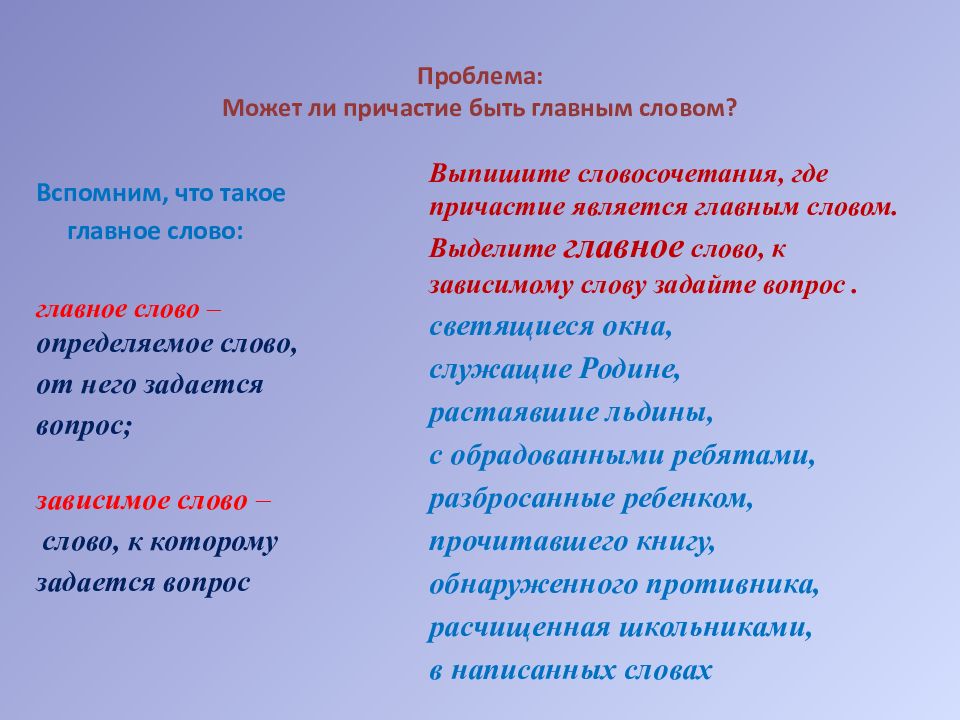 Вспомним, что такое главное слово: главное слово – определяемое слово, от него задается вопрос; зависимое слово – слово, к которому задается вопрос Выпишите словосочетания, где причастие является главным словом. В ыделите главное слово, к зависимому слову задайте вопрос. с ветящиеся окна, служащие Родине, р астаявшие льдины, с обрадованными ребятами, разбросанные ребенком, прочитавшего книгу, обнаруженного противника, расчищенная школьниками, в написанных словах
