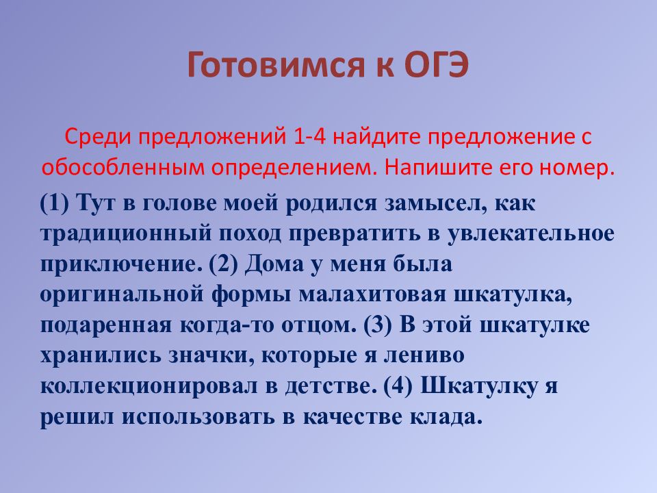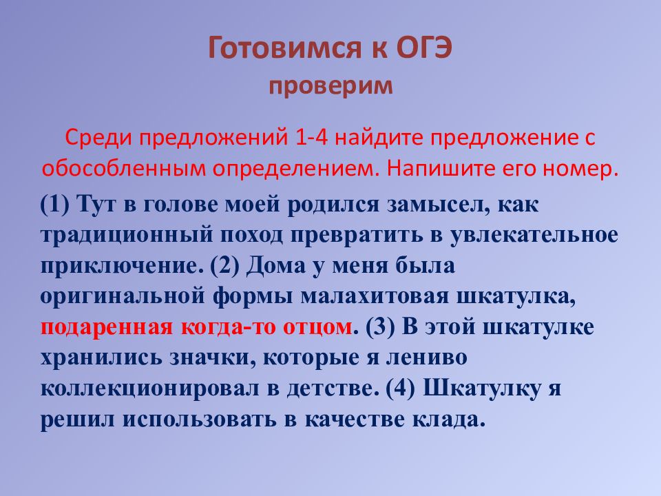 Среди предложений 1-4 найдите предложение с обособленным определением. Напишите его номер. ( 1 ) Тут в голове моей родился замысел, как традиционный поход превратить в увлекательное приключение. ( 2 ) Дома у меня была оригинальной формы малахитовая шкатулка, подаренная когда-то отцом. ( 3 ) В этой шкатулке хранились значки, которые я лениво коллекционировал в детстве. ( 4 ) Шкатулку я решил использовать в качестве клада.