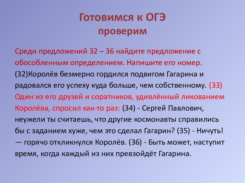Среди предложений 32 – 36 найдите предложение с обособленным определением. Напишите его номер. (32)Королёв безмерно гордился подвигом Гагарина и радовался его успеху куда больше, чем собственному. (33) Один из его друзей и соратников, удивлённый ликованием Королёва, спросил как-то раз: (34) - Сергей Павлович, неужели ты считаешь, что другие космонавты справились бы с заданием хуже, чем это сделал Гагарин? (35) - Ничуть! — горячо откликнулся Королёв. (36) - Быть может, наступит время, когда каждый из них превзойдёт Гагарина.