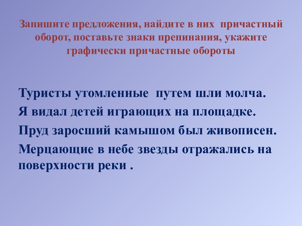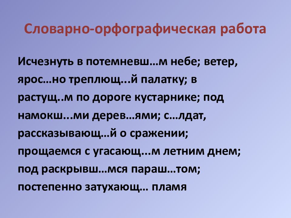 Исчезнуть в потемневш …м небе; ветер, ярос …но треплющ...й палатку; в растущ..м по дороге кустарнике; под намокш...ми дерев… ями ; с… лдат, рассказывающ …й о сражении; прощаемся с угасающ...м летним днем; под раскрывш … мся параш…том; постепенно затухающ … пламя