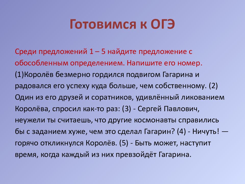 Среди предложений 1 – 5 найдите предложение с обособленным определением. Напишите его номер. ( 1 )Королёв безмерно гордился подвигом Гагарина и радовался его успеху куда больше, чем собственному. ( 2 ) Один из его друзей и соратников, удивлённый ликованием Королёва, спросил как-то раз: ( 3 ) - Сергей Павлович, неужели ты считаешь, что другие космонавты справились бы с заданием хуже, чем это сделал Гагарин? ( 4 ) - Ничуть! — горячо откликнулся Королёв. ( 5 ) - Быть может, наступит время, когда каждый из них превзойдёт Гагарина.
