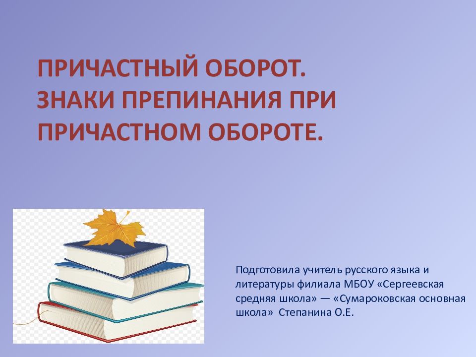 Подготовила учитель русского языка и литературы филиала МБОУ « Сергеевская средняя школа» — « Сумароковская основная школа» Степанина О.Е. ПРИЧАСТНЫЙ ОБОРОТ. ЗНАКИ ПРЕПИНАНИЯ ПРИ ПРИЧАСТНОМ ОБОРОТЕ.