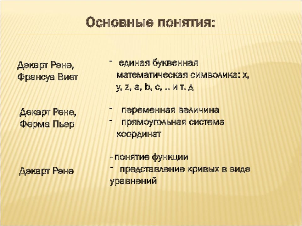 Декарт Рене, Франсуа Виет Декарт Рене, Ферма Пьер Декарт Рене - понятие функции представление кривых в виде уравнений единая буквенная математическая символика: x, y, z, a, b, c,.. и т. д переменная величина прямоугольная система координат Основные понятия: