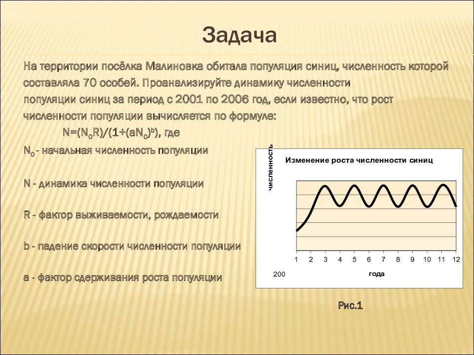 На территории посёлка Малиновка обитала популяция синиц, численность которой составляла 70 особей. Проанализируйте динамику численности популяции синиц за период с 2001 по 2006 год, если известно, что рост численности популяции вычисляется по формуле: N=(N 0 R)/(1+(aN 0 ) b ), где N 0 - начальная численность популяции N - динамика численности популяции R - фактор выживаемости, рождаемости b - падение скорости численности популяции a - фактор сдерживания роста популяции Рис.1 200