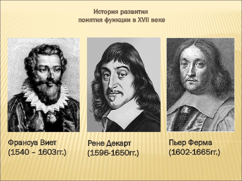 Франсуа Виет (1540 – 1603гг.) История развития понятия функции в XVII веке Рене Декарт (1596-1650гг.) Пьер Ферма (1602-1665гг.)