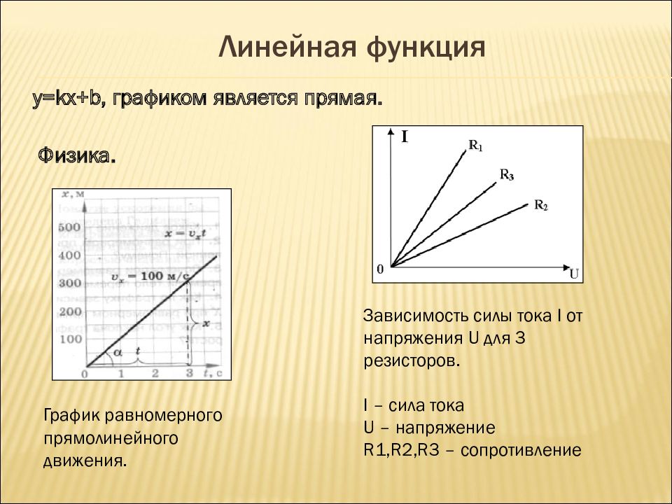 График равномерного прямолинейного движения. Физика. Зависимость силы тока I от напряжения U для 3 резисторов. I – c ила тока U – напряжение R1,R2,R3 – сопротивление y=kx+b, графиком является прямая.