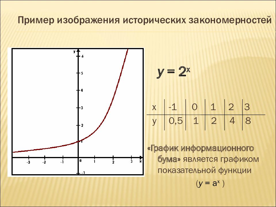 y = 2 x x -1 0 1 2 3 y 0,5 1 2 4 8 «График информационного бума» является графиком показательной функции ( y = a x )
