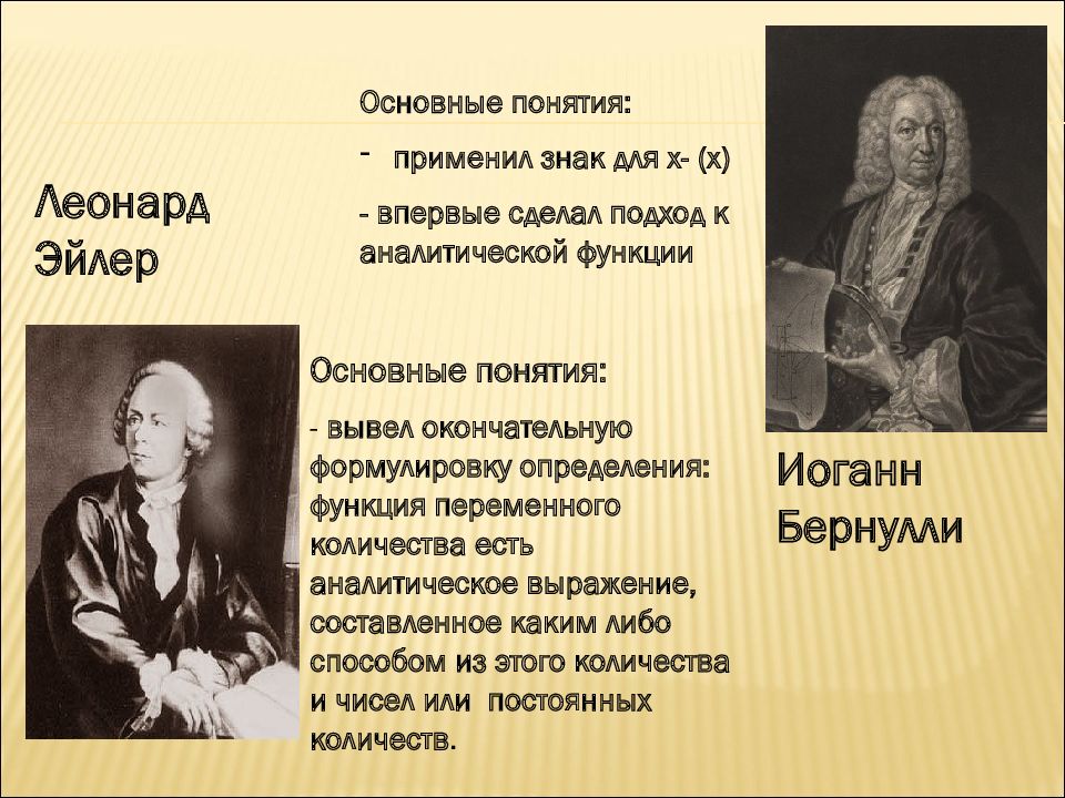 Основные понятия: применил знак для х- (х) - впервые сделал подход к аналитической функции Иоганн Бернулли Леонард Эйлер Основные понятия: - вывел окончательную формулировку определения: функция переменного количества есть аналитическое выражение, составленное каким либо способом из этого количества и чисел или постоянных количеств.