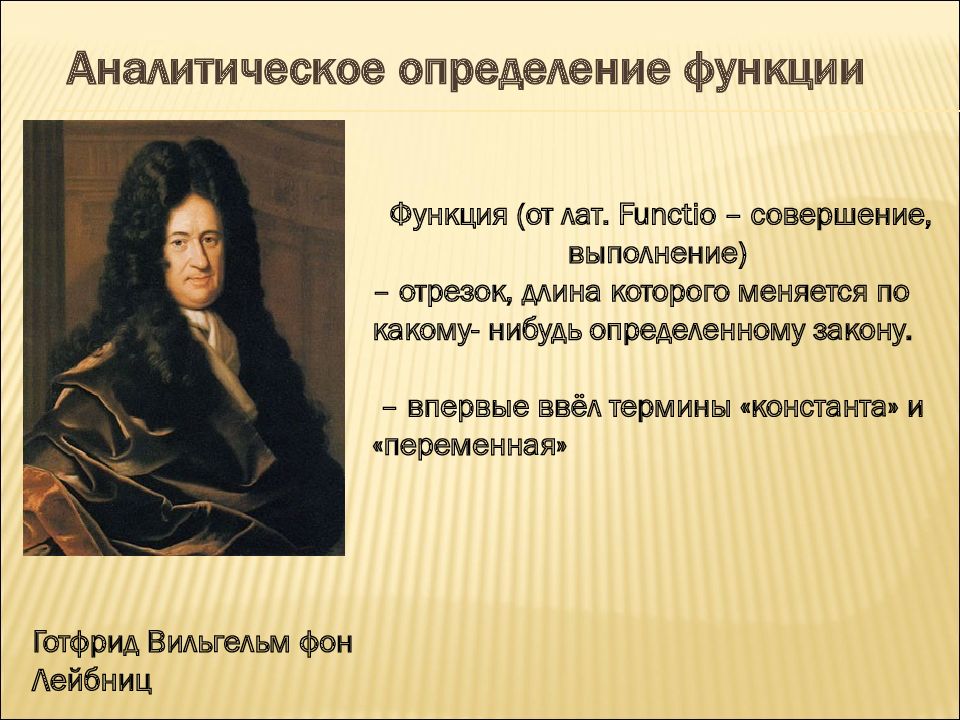 Готфрид Вильгельм фон Лейбниц Функция (от лат. Functio – совершение, выполнение ) – отрезок, длина которого меняется по какому- нибудь определенному закону. – впервые ввёл термины «константа» и «переменная» Аналитическое определение функции