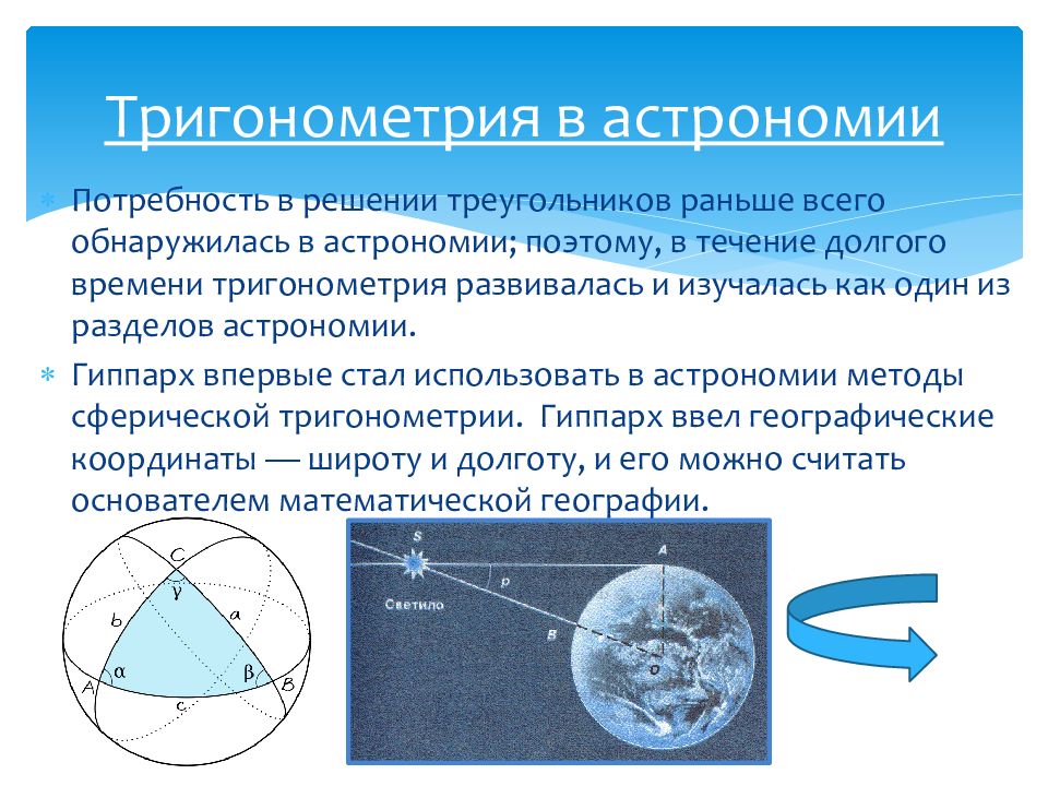 Потребность в решении треугольников раньше всего обнаружилась в астрономии; поэтому, в течение долгого времени тригонометрия развивалась и изучалась как один из разделов астрономии. Гиппарх впервые стал использовать в астрономии методы сферической тригонометрии. Гиппарх ввел географические координаты — широту и долготу, и его можно считать основателем математической географии. Тригонометрия в астрономии