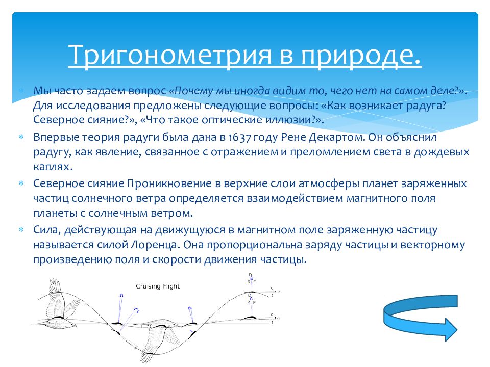 Мы часто задаем вопрос «Почему мы иногда видим то, чего нет на самом деле?». Для исследования предложены следующие вопросы: «Как возникает радуга? Северное сияние?», «Что такое оптические иллюзии ?». Впервые теория радуги была дана в 1637 году Рене Декартом. Он объяснил радугу, как явление, связанное с отражением и преломлением света в дождевых каплях. Северное сияние Проникновение в верхние слои атмосферы планет заряженных частиц солнечного ветра определяется взаимодействием магнитного поля планеты с солнечным ветром. Сила, действующая на движущуюся в магнитном поле заряженную частицу называется силой Лоренца. Она пропорциональна заряду частицы и векторному произведению поля и скорости движения частицы. Тригонометрия в природе.
