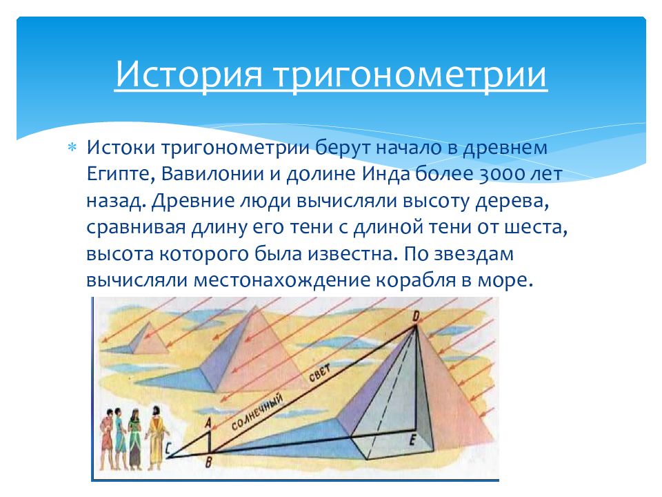 Истоки тригонометрии берут начало в древнем Египте, Вавилонии и долине Инда более 3000 лет назад. Древние люди вычисляли высоту дерева, сравнивая длину его тени с длиной тени от шеста, высота которого была известна. По звездам вычисляли местонахождение корабля в море. История тригонометрии