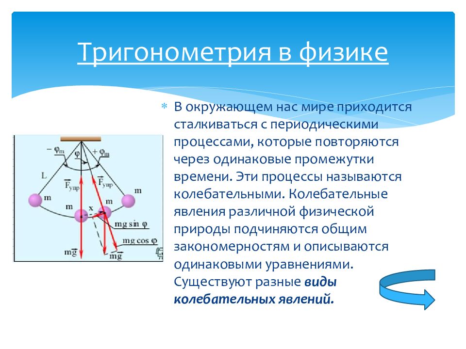 В окружающем нас мире приходится сталкиваться с периодическими процессами, которые повторяются через одинаковые промежутки времени. Эти процессы называются колебательными. Колебательные явления различной физической природы подчиняются общим закономерностям и описываются одинаковыми уравнениями. Существуют разные виды колебательных явлений. Тригонометрия в физике
