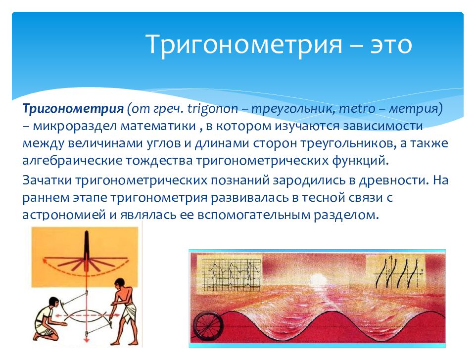 Тригонометрия (от греч. trigonon – треугольник, metro – метрия) – микрораздел математики, в котором изучаются зависимости между величинами углов и длинами сторон треугольников, а также алгебраические тождества тригонометрических функций. Зачатки тригонометрических познаний зародились в древности. На раннем этапе тригонометрия развивалась в тесной связи с астрономией и являлась ее вспомогательным разделом. Тригонометрия – это