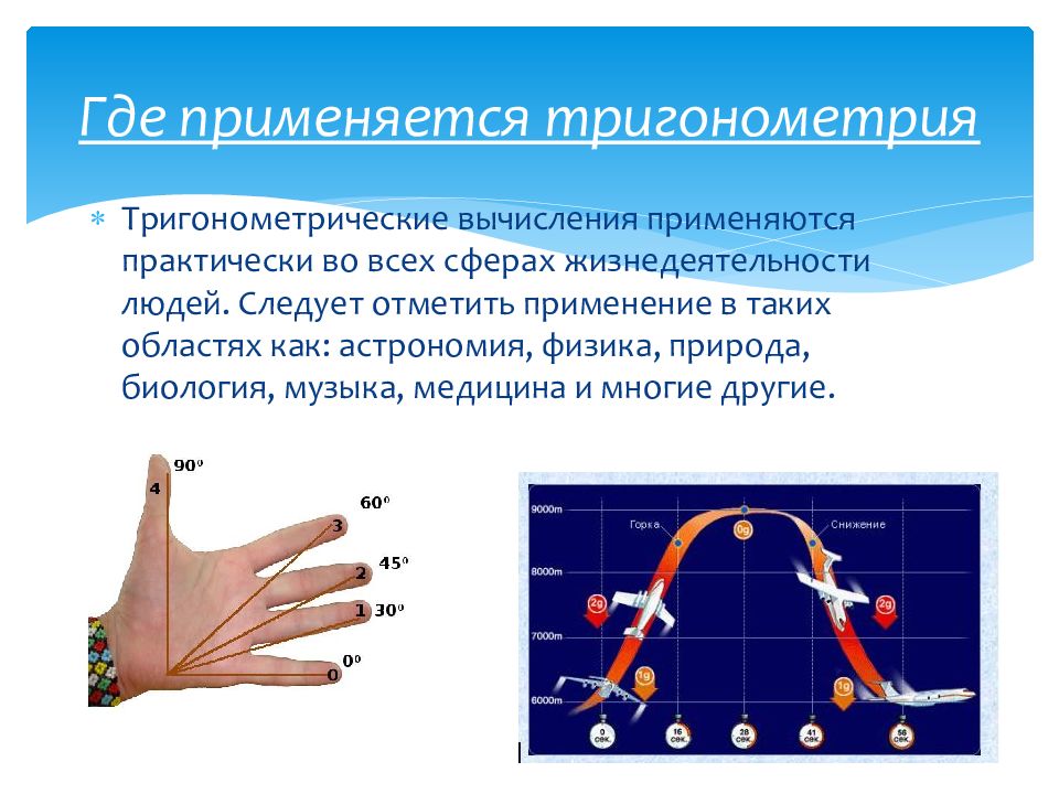 Тригонометрические вычисления применяются практически во всех сферах жизнедеятельности людей. Следует отметить применение в таких областях как: астрономия, физика, природа, биология, музыка, медицина и многие другие. Где применяется тригонометрия