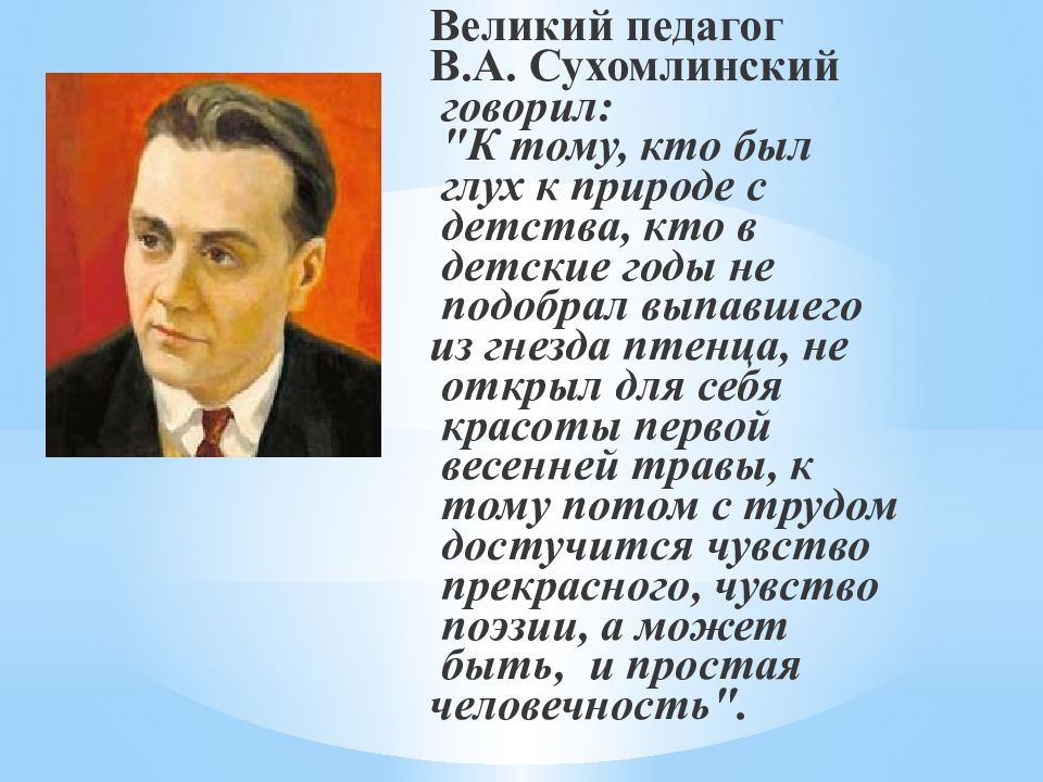 Великий педагог В.А. Сухомлинский говорил: "К тому, кто был глух к природе с детства, кто в детские годы не подобрал выпавшего из гнезда птенца, не открыл для себя красоты первой весенней травы, к тому потом с трудом достучится чувство прекрасного, чувство поэзии, а может быть, и простая человечность".