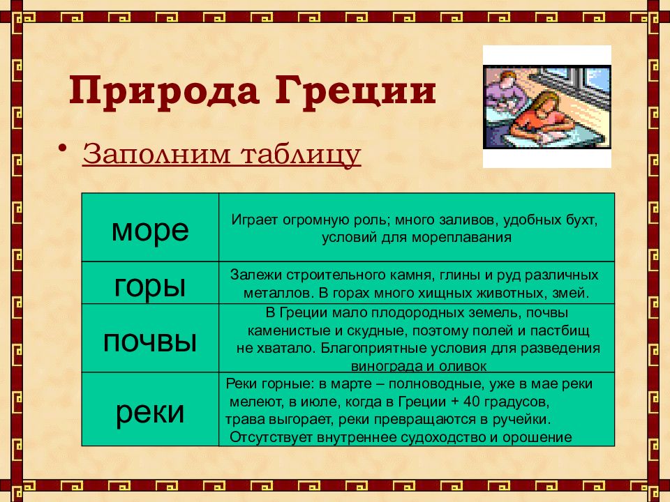 Заполним таблицу море Играет огромную роль; много заливов, удобных бухт, условий для мореплавания горы Залежи строительного камня, глины и руд различных металлов. В горах много хищных животных, змей. почвы В Греции мало плодородных земель, почвы каменистые и скудные, поэтому полей и пастбищ не хватало. Благоприятные условия для разведения винограда и оливок реки Реки горные: в марте – полноводные, уже в мае реки мелеют, в июле, когда в Греции + 40 градусов, трава выгорает, реки превращаются в ручейки. Отсутствует внутреннее судоходство и орошение