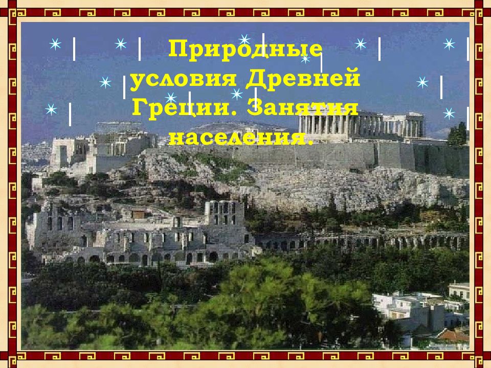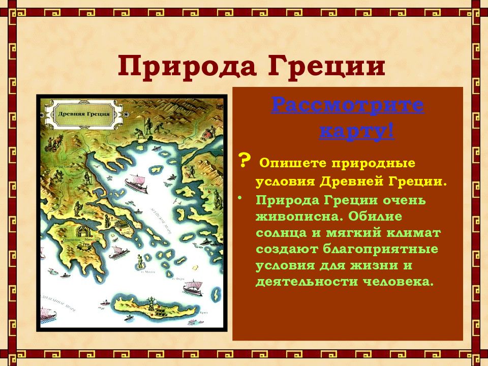 Рассмотрите карту! ? Опишете природные условия Древней Греции. Природа Греции очень живописна. Обилие солнца и мягкий климат создают благоприятные условия для жизни и деятельности человека.