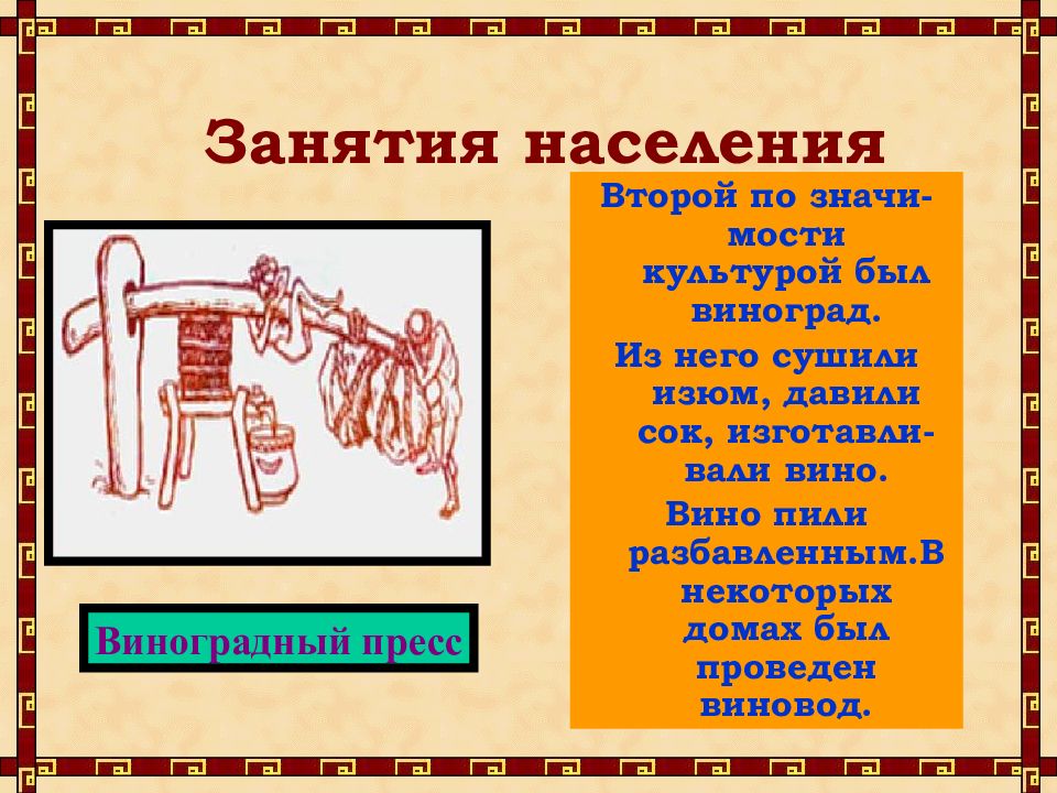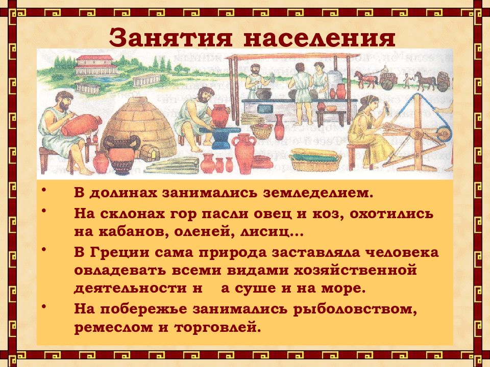 В долинах занимались земледелием. На склонах гор пасли овец и коз, охотились на кабанов, оленей, лисиц… В Греции сама природа заставляла человека овладевать всеми видами хозяйственной деятельности н а суше и на море. На побережье занимались рыболовством, ремеслом и торговлей.