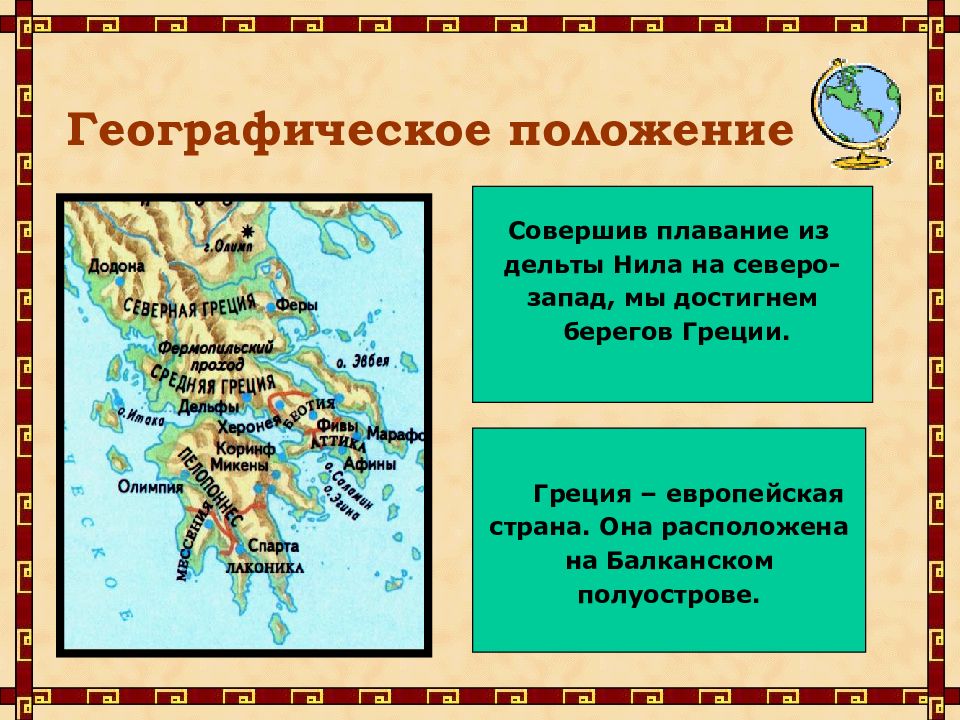 Греция – европейская страна. Она расположена на Балканском полуострове. Совершив плавание из дельты Нила на северо- запад, мы достигнем берегов Греции.