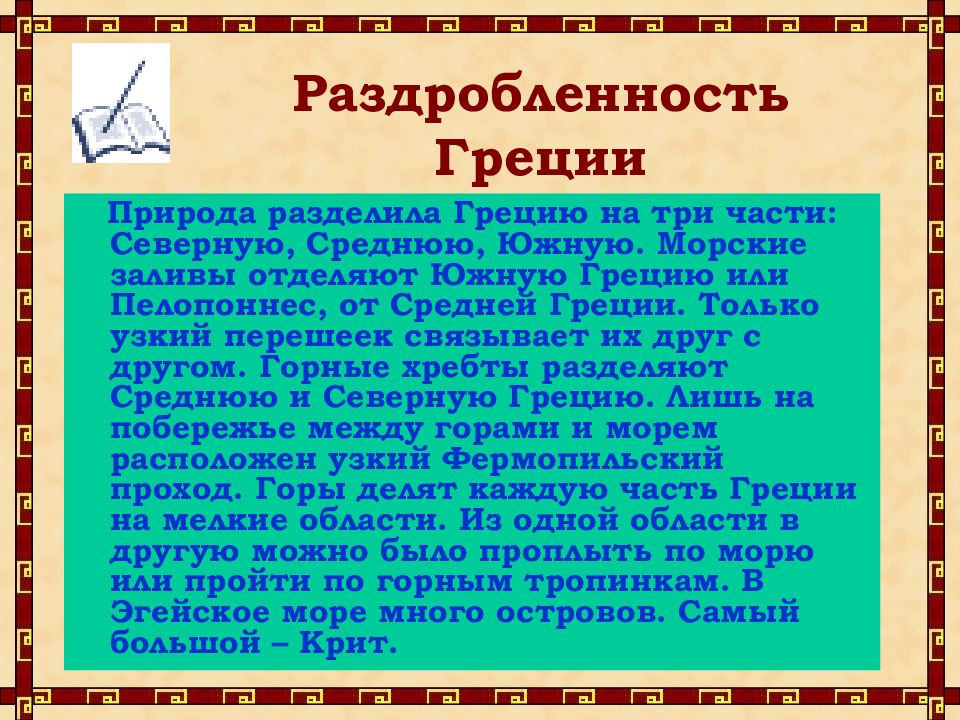 Природа разделила Грецию на три части: Северную, Среднюю, Южную. Морские заливы отделяют Южную Грецию или Пелопоннес, от Средней Греции. Только узкий перешеек связывает их друг с другом. Горные хребты разделяют Среднюю и Северную Грецию. Лишь на побережье между горами и морем расположен узкий Фермопильский проход. Горы делят каждую часть Греции на мелкие области. Из одной области в другую можно было проплыть по морю или пройти по горным тропинкам. В Эгейское море много островов. Самый большой – Крит.