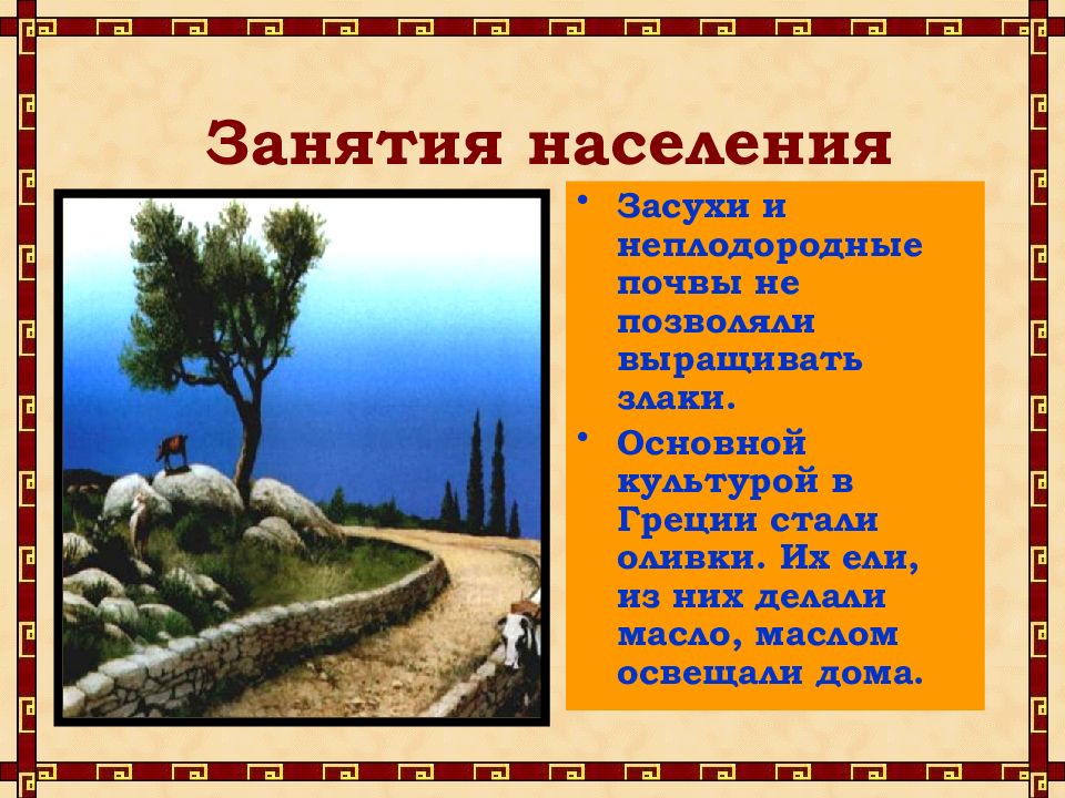 Засухи и неплодородные почвы не позволяли выращивать злаки. Основной культурой в Греции стали оливки. Их ели, из них делали масло, маслом освещали дома.
