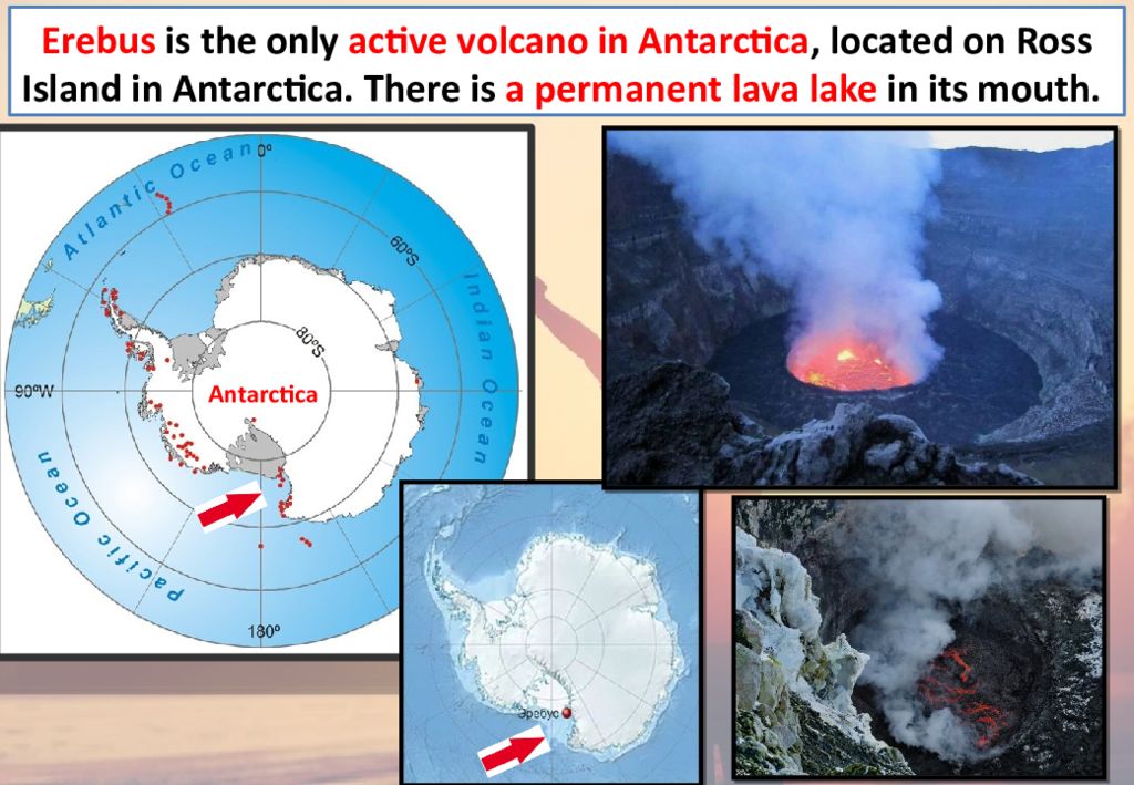 Erebus is the only active volcano in Antarctica, located on Ross Island in Antarctica. There is a permanent lava lake in its mouth. Antarctica