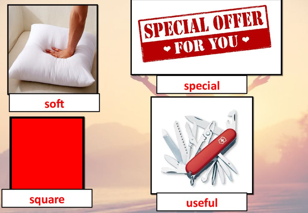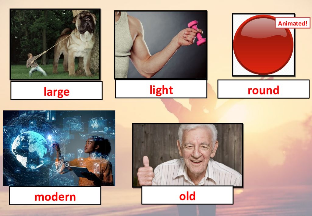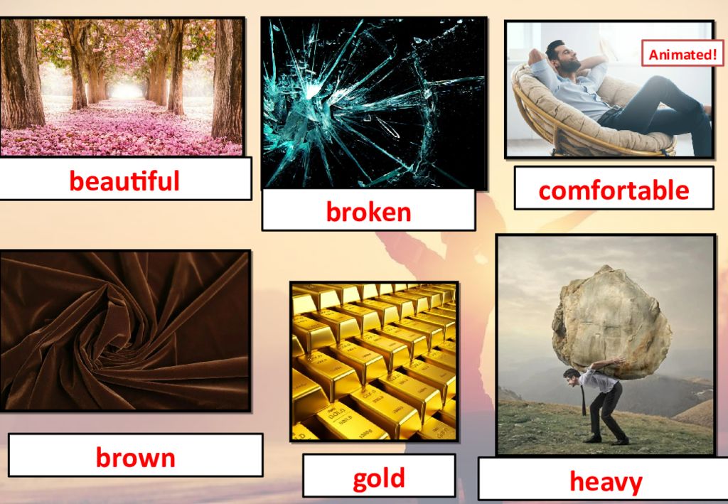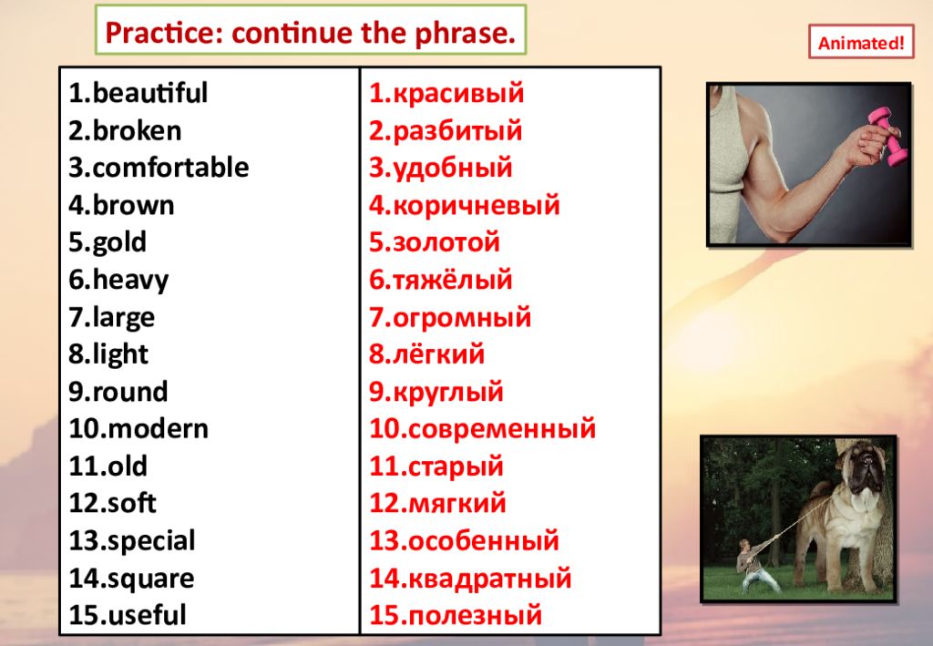 1. beautiful 2. broken 3. comfortable 4. brown 5. gold 6. heavy 7. large 8. light 9. round 10. modern 11. old 12. soft 13. special 14. square 15. useful 1.красивый 2.разбитый 3.удобный 4.коричневый 5.золотой 6.тяжёлый 7.огромный 8.лёгкий 9.круглый 10.современный 11.старый 12.мягкий 13.особенный 14.квадратный 15.полезный Practice: continue the phrase. Animated!
