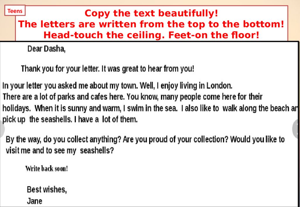 Copy the text beautifully! The letters are written from the top to the bottom! Head-touch the ceiling. Feet-on the floor! Teens