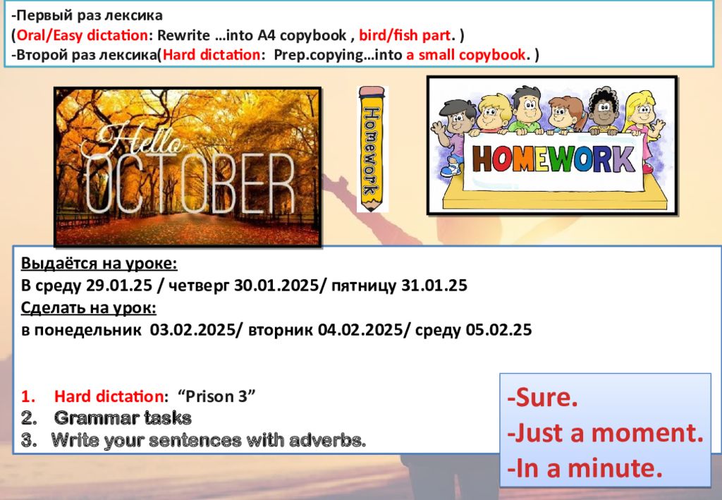 Выдаётся на уроке : В среду 29.01.25 / четверг 30.01.2025/ пятницу 31.01.25 Сделать на урок: в понедельник 03. 02.202 5 / вторник 04. 02.202 5 / среду 05. 02.2 5 Hard dictation : “Prison 3” Grammar tasks 3. Write your sentences with adverbs. - Первый раз лексика ( Oral/Easy dictation : Rewrite …into A4 copybook, bird/fish part. ) -Второй раз лексика( Hard dictation : Prep.copying …into a small copybook. ) -Sure. -Just a moment. -In a minute.