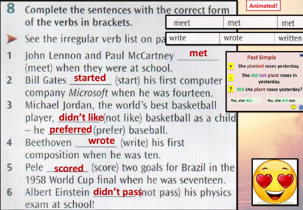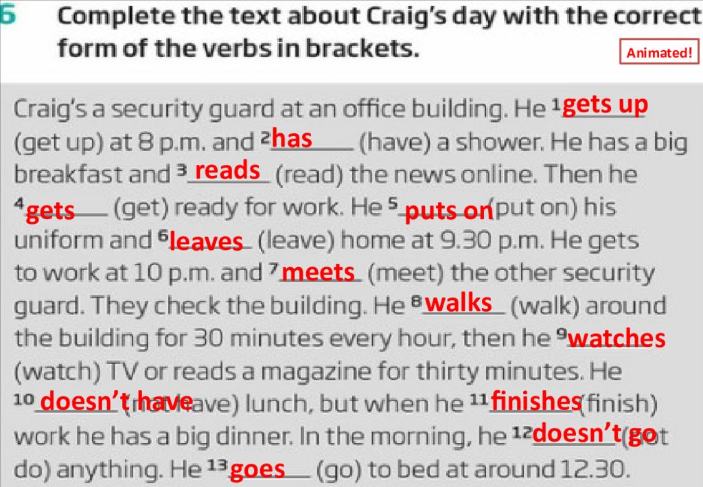 gets up has reads gets puts on leaves meets walks watches doesn’t have finishes doesn’t go goes Animated!