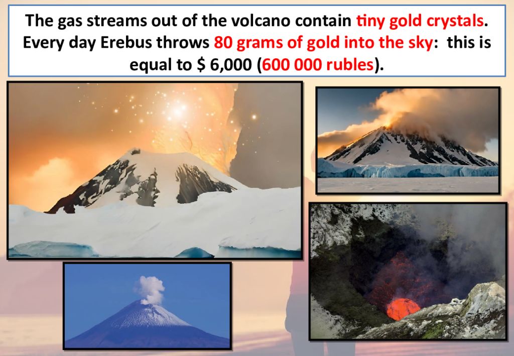 The gas streams out of the volcano contain tiny gold crystals. Every day Erebus throws 80 grams of gold into the sky : this is equal to $ 6,000 ( 600 000 rubles ).