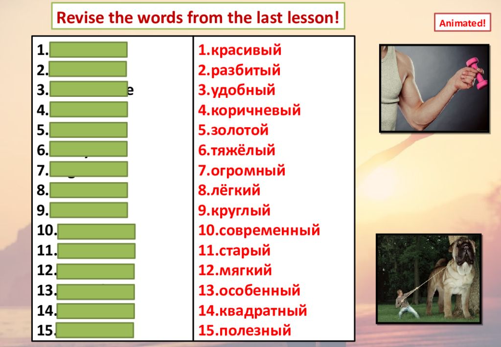 1. beautiful 2. broken 3. comfortable 4. brown 5. gold 6. heavy 7. large 8. light 9. round 10. modern 11. old 12. soft 13. special 14. square 15. useful 1.красивый 2.разбитый 3.удобный 4.коричневый 5.золотой 6.тяжёлый 7.огромный 8.лёгкий 9.круглый 10.современный 11.старый 12.мягкий 13.особенный 14.квадратный 15.полезный Revise the words from the last lesson! Animated!