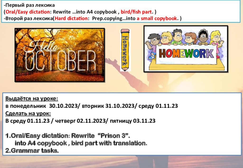 Выдаётся на уроке : в понедельник 30. 10.2023/ вторник 31.10. 202 3/ среду 01.1 1.23 Сделать на урок: В среду 01.1 1.23 / четверг 02.1 1.2023/ пятницу 03.1 1.23 1. Oral/Easy dictation : Rewrite “Prison 3”. into A4 copybook, bird part with translation. 2. Grammar tasks. - Первый раз лексика ( Oral/Easy dictation : Rewrite …into A4 copybook, bird/fish part. ) -Второй раз лексика( Hard dictation : Prep.copying …into a small copybook. )