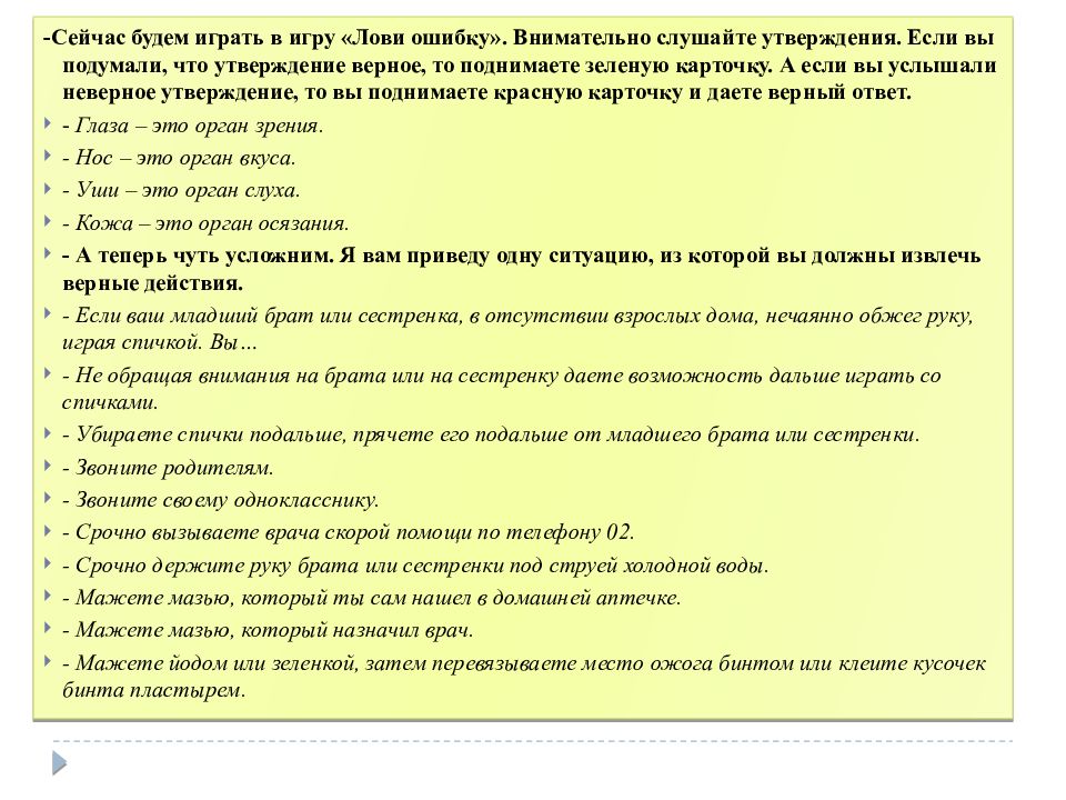 -Сейчас будем играть в игру «Лови ошибку». Внимательно слушайте утверждения. Если вы подумали, что утверждение верное, то поднимаете зеленую карточку. А если вы услышали неверное утверждение, то вы поднимаете красную карточку и даете верный ответ. - Глаза – это орган зрения. - Нос – это орган вкуса. - Уши – это орган слуха. - Кожа – это орган осязания. - А теперь чуть усложним. Я вам приведу одну ситуацию, из которой вы должны извлечь верные действия. - Если ваш младший брат или сестренка, в отсутствии взрослых дома, нечаянно обжег руку, играя спичкой. Вы… - Не обращая внимания на брата или на сестренку даете возможность дальше играть со спичками. - Убираете спички подальше, прячете его подальше от младшего брата или сестренки. - Звоните родителям. - Звоните своему однокласснику. - Срочно вызываете врача скорой помощи по телефону 02. - Срочно держите руку брата или сестренки под струей холодной воды. - Мажете мазью, который ты сам нашел в домашней аптечке. - Мажете мазью, который назначил врач. - Мажете йодом или зеленкой, затем перевязываете место ожога бинтом или клеите кусочек бинта пластырем.