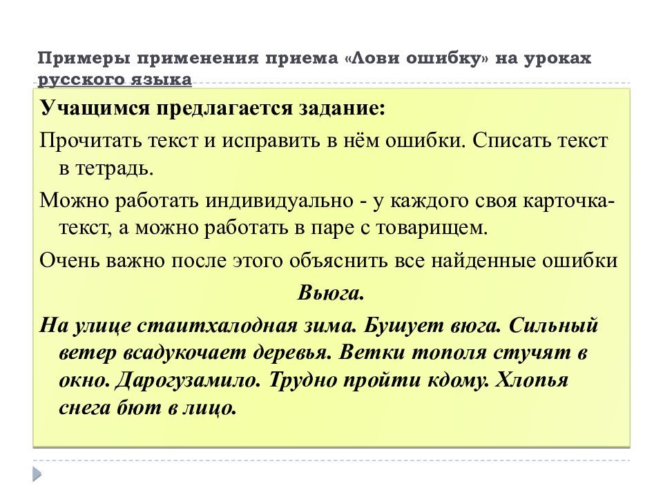 При объяснении нового материала или желая заострить внимание учащихся на проблемном месте в задании, педагог намеренно допускает ошибку (одну или несколько). Можно заранее оповестить детей о ее наличии. Обнаружив неточность, учащиеся вносят коррективы, оглашают правильный вариант.