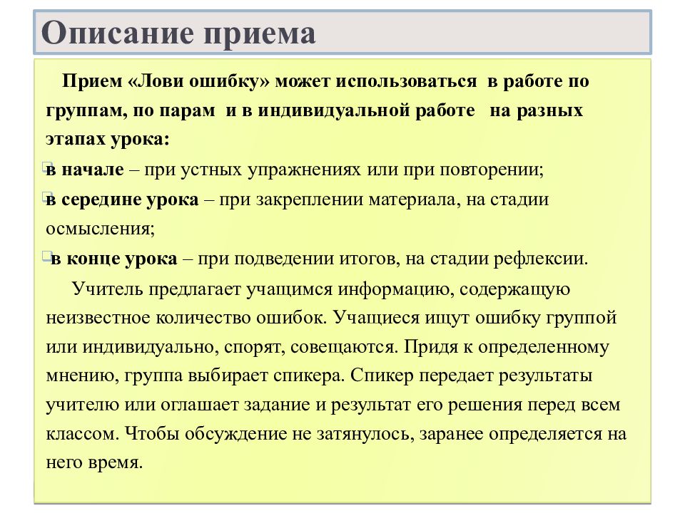 Прием «Лови ошибку» может использоваться в работе по группам, по парам и в индивидуальной работе на разных этапах урока: в начале – при устных упражнениях или при повторении; в середине урока – при закреплении материала, на стадии осмысления; в конце урока – при подведении итогов, на стадии рефлексии. Учитель предлагает учащимся информацию, содержащую неизвестное количество ошибок. Учащиеся ищут ошибку группой или индивидуально, спорят, совещаются. Придя к определенному мнению, группа выбирает спикера. Спикер передает результаты учителю или оглашает задание и результат его решения перед всем классом. Чтобы обсуждение не затянулось, заранее определяется на него время.