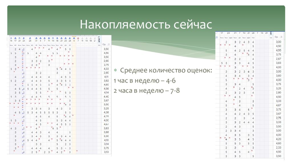 Среднее количество оценок: 1 час в неделю – 4-6 2 часа в неделю – 7-8 Накопляемость сейчас