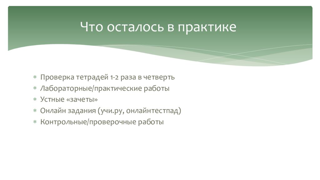 Проверка тетрадей 1-2 раза в четверть Лабораторные/практические работы Устные «зачеты» Онлайн задания ( учи.ру, онлайнтестпад ) Контрольные/проверочные работы Что осталось в практике