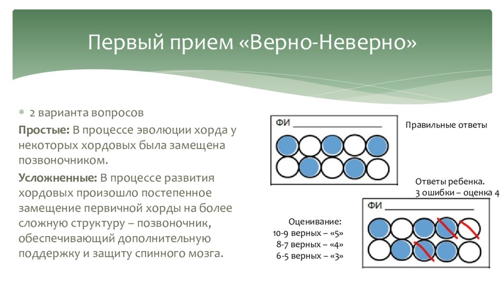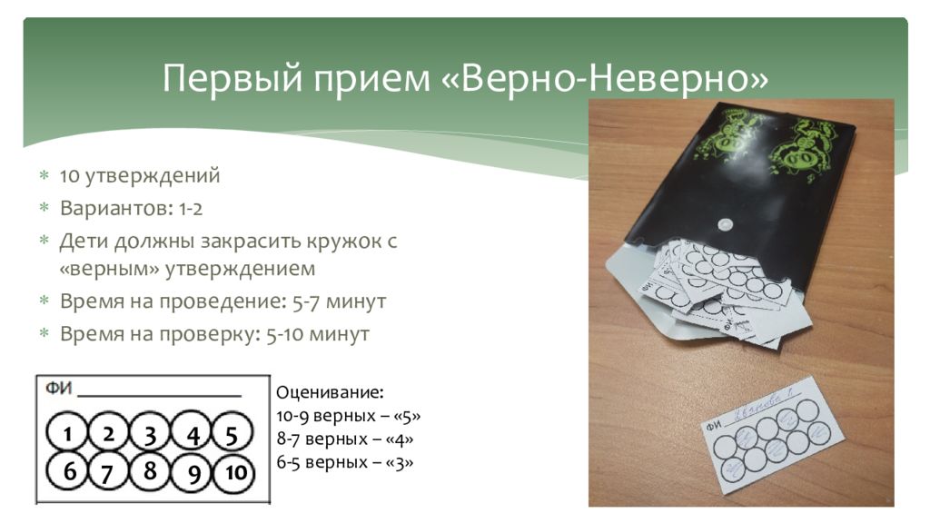 10 утверждений Вариантов: 1-2 Дети должны закрасить кружок с «верным» утверждением Время на проведение: 5-7 минут Время на проверку: 5-10 минут Первый прием «Верно-Неверно» 2 3 4 5 6 7 8 9 10 Оценивание: 10-9 верных – «5» 8-7 верных – «4» 6-5 верных – «3»