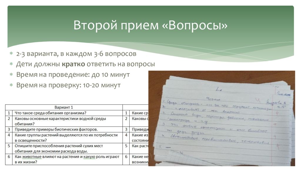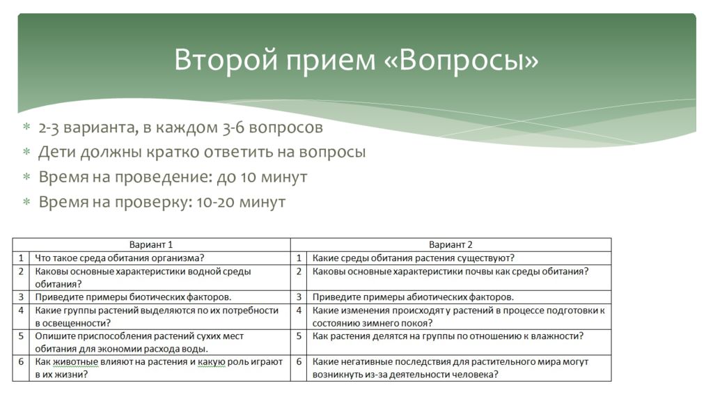 2-3 варианта, в каждом 3-6 вопросов Дети должны кратко ответить на вопросы Время на проведение: до 10 минут Время на проверку: 10-20 минут Второй прием «Вопросы»