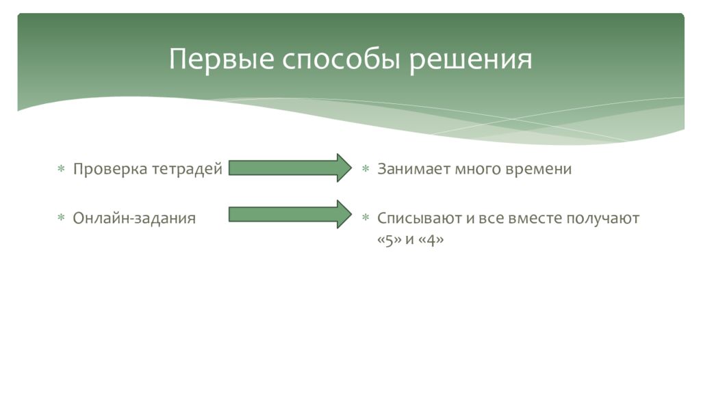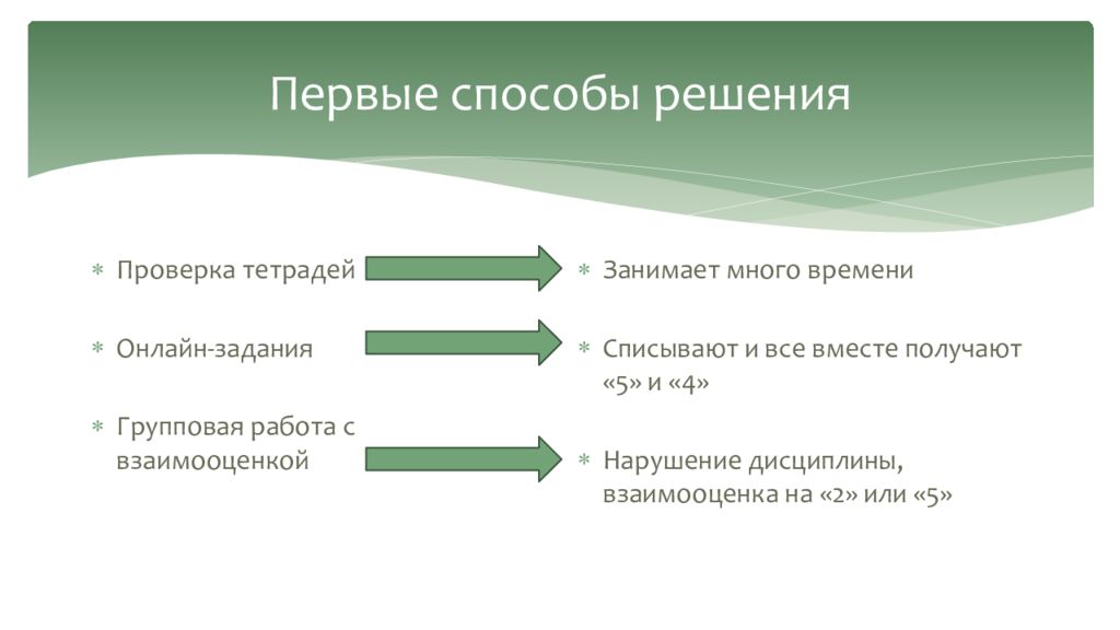 Проверка тетрадей Онлайн-задания Групповая работа с взаимооценкой Занимает много времени Списывают и все вместе получают «5» и «4» Нарушение дисциплины, взаимооценка на «2» или «5»
