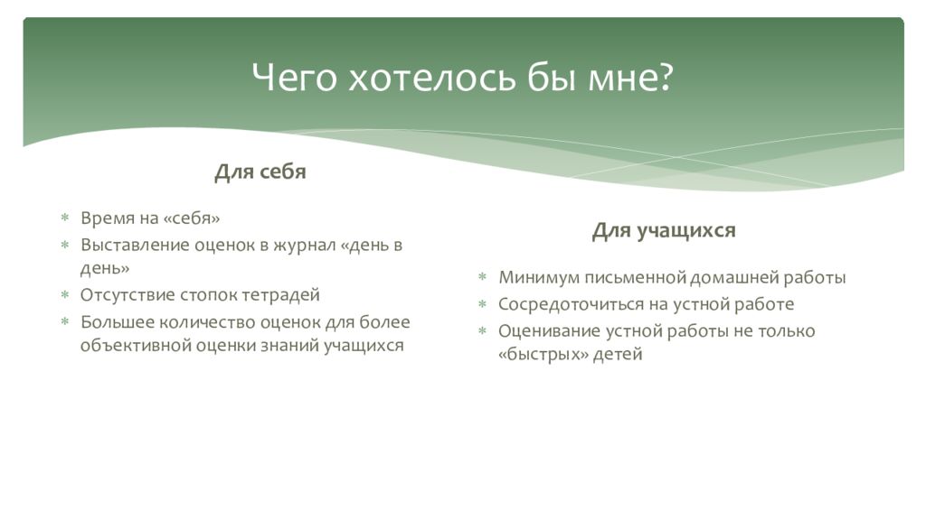 Для себя Время на «себя» Выставление оценок в журнал «день в день» Отсутствие стопок тетрадей Большее количество оценок для более объективной оценки знаний учащихся Для учащихся Минимум письменной домашней работы Сосредоточиться на устной работе Оценивание устной работы не только «быстрых» детей