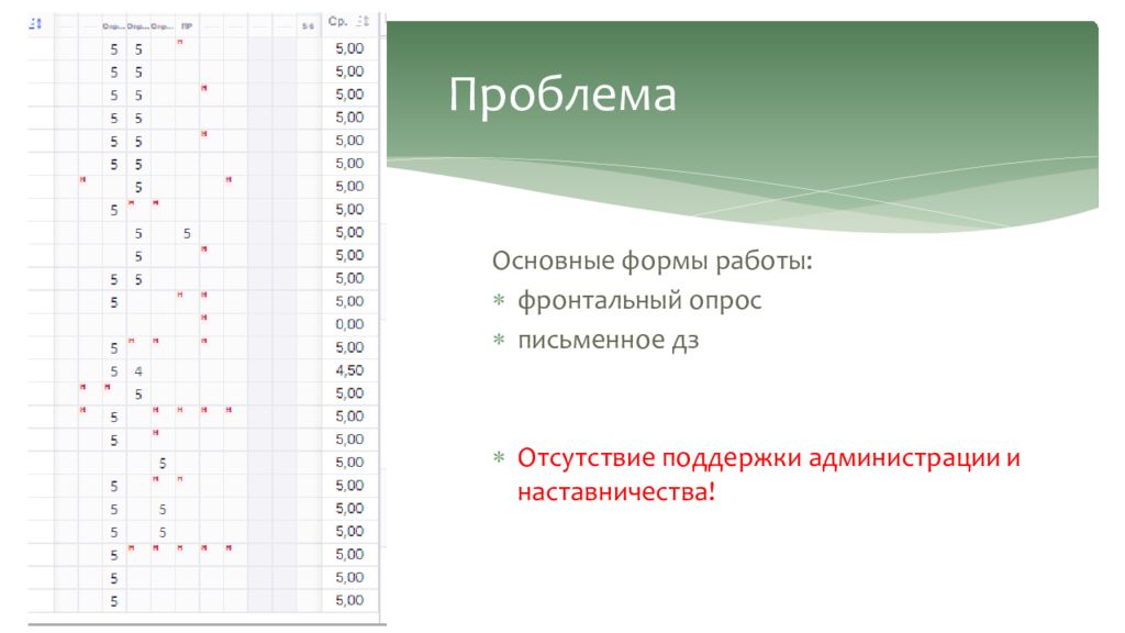 Основные формы работы: фронтальный опрос письменное дз Отсутствие поддержки администрации и наставничества!