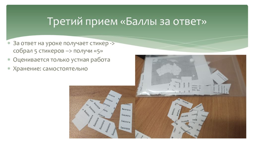 За ответ на уроке получает стикер -> c обрал 5 стикеров – > получи «5 » Оценивается только устная работа Хранение : самостоятельно Третий прием «Баллы за ответ»