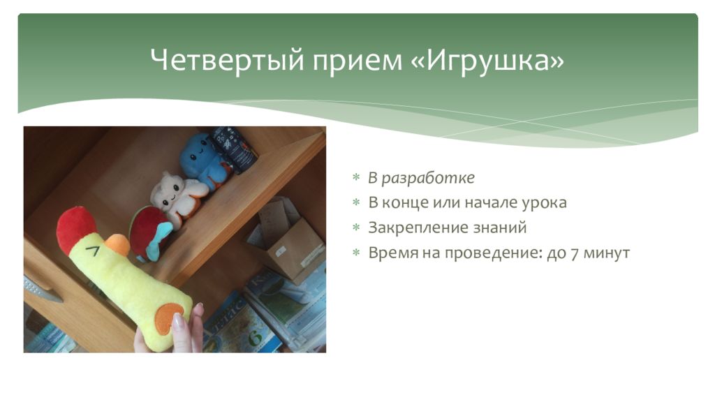 В разработке В конце или начале урока Закрепление знаний Время на проведение: до 7 минут Четвертый прием «Игрушка»