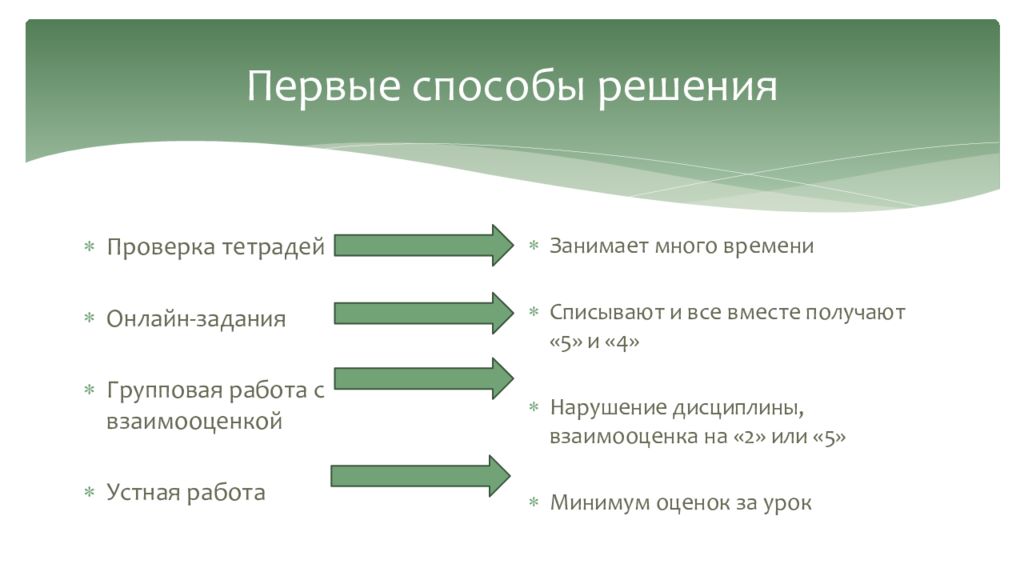 Проверка тетрадей Онлайн-задания Групповая работа с взаимооценкой Устная работа Занимает много времени Списывают и все вместе получают «5» и «4» Нарушение дисциплины, взаимооценка на «2» или «5» Минимум оценок за урок