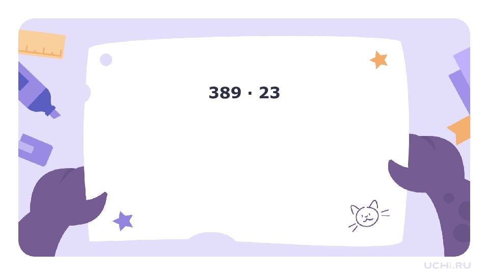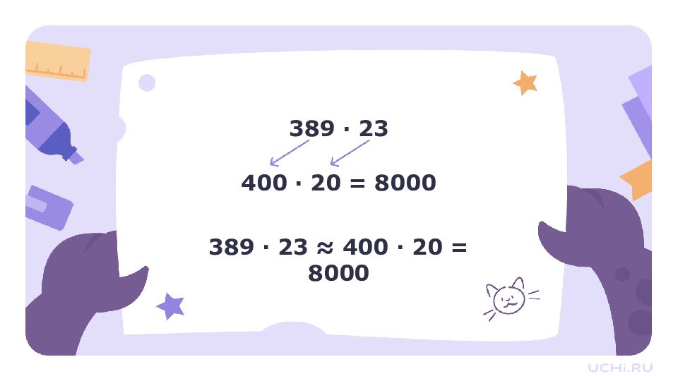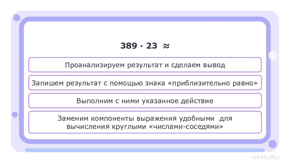389 ∙ 23 ≈ Проанализируем результат и сделаем вывод Запишем результат с помощью знака «приблизительно равно» Выполним с ними указанное действие Заменим компоненты выражения удобными для вычисления круглыми «числами-соседями»