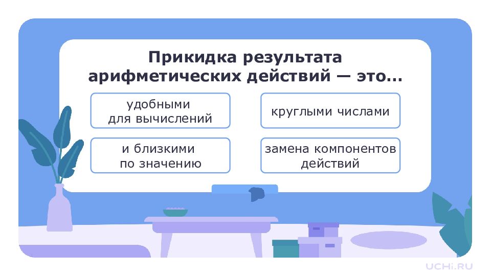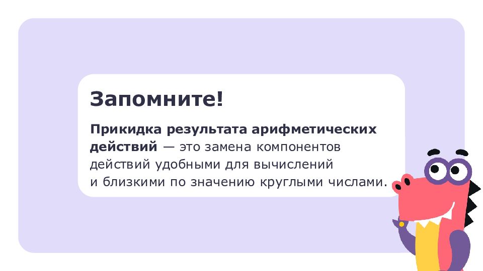 Запомните! Прикидка результата арифметических действий — это замена компонентов действий удобными для вычислений и близкими по значению круглыми числами.